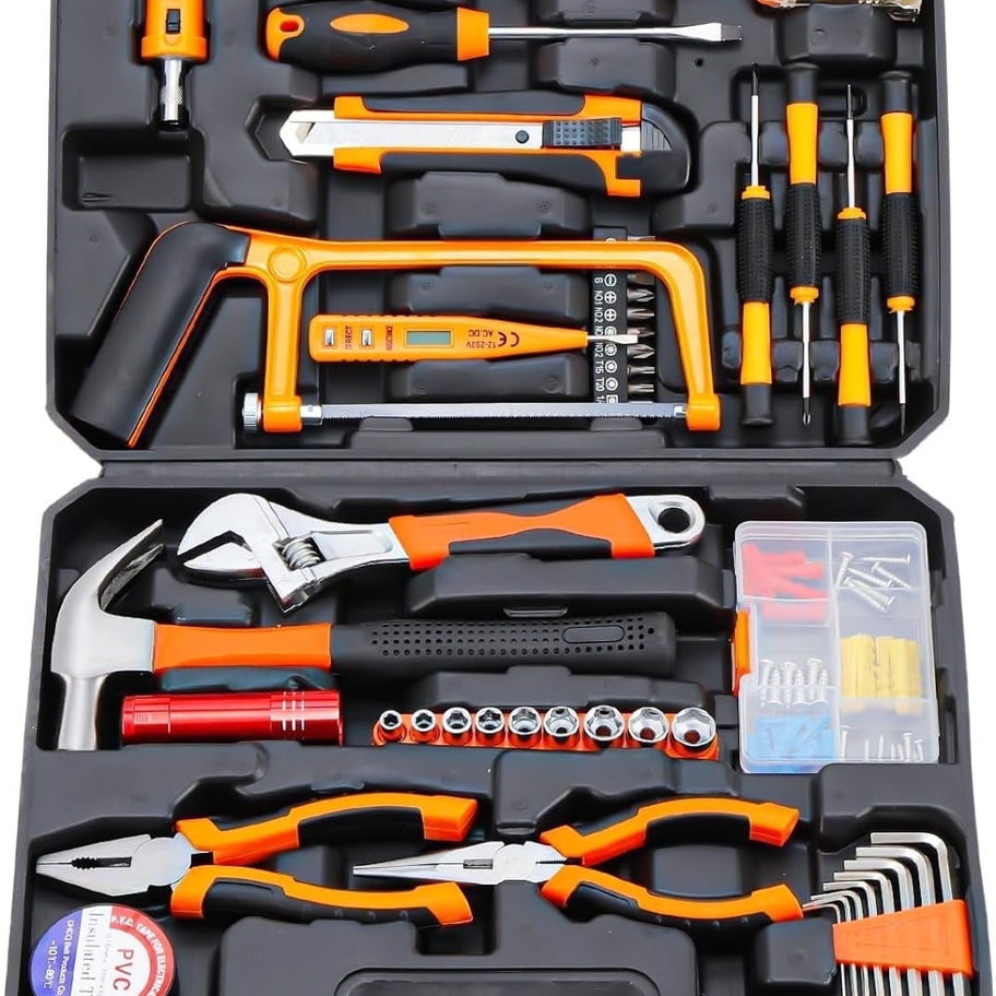 This 105 pieces tool set covers most basic daily household tools, such as maintaining kitchen supplies, repairing houses, replacing bathroom faucets, and more. Suitable for repair workers, handyman, construction workers, and mechanics. It is also very suitable for DIY enthusiasts to complete new designs at home.