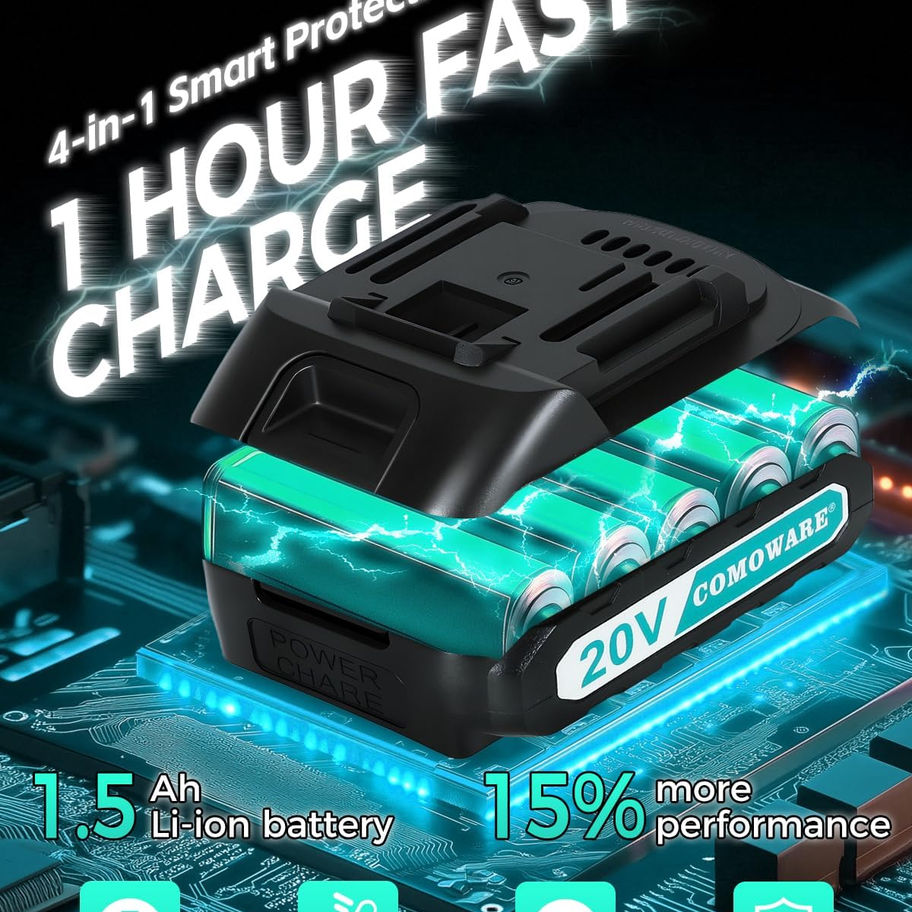 【1500mAh Batteries & 60min Fast Charger】20V 1500mAh Lithium-Ion battery packed with higher capacity indicator lets you finish your job smoothly with long lasting performance. 1.5A 1-hour fast charger keeps your drill constantly running.