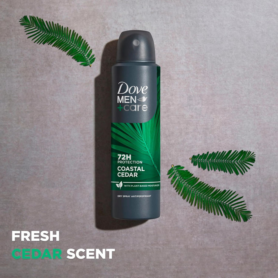 Dove Men+Care Cedarwood + Tonka antiperspirant dry spray deodorant delivers long-lasting 72-hour protection against sweat and odor.