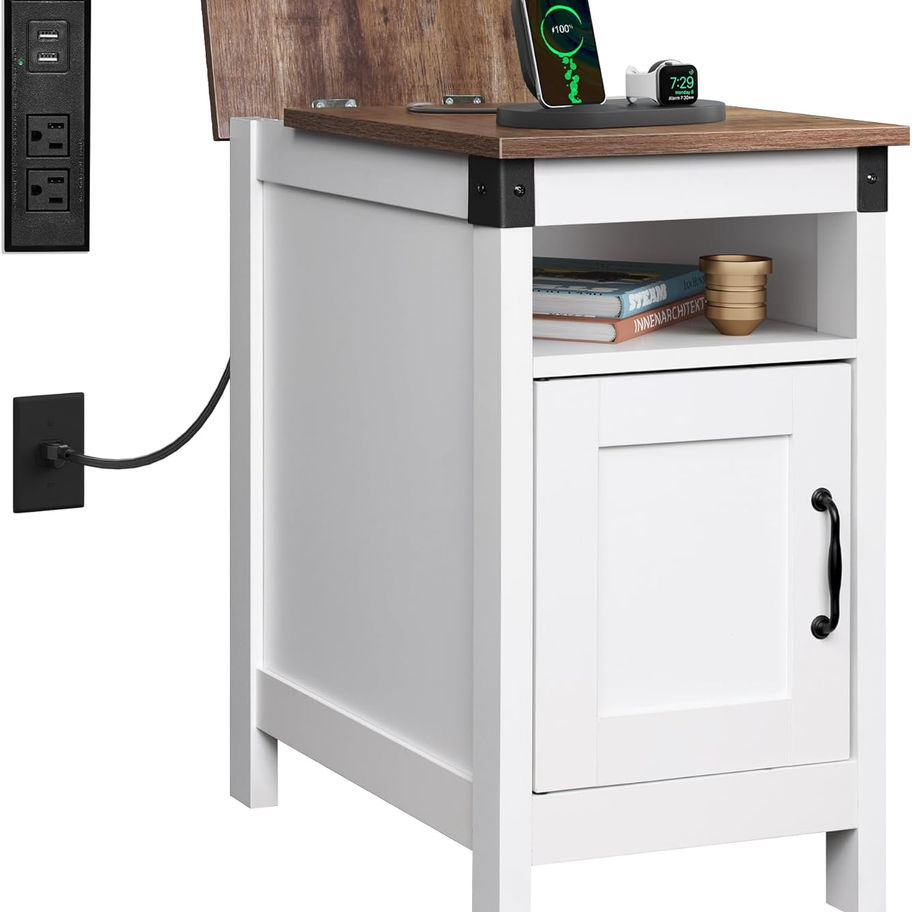 End Table with Charging Station, Narrow Side Table for Living Room, Farmhouse N