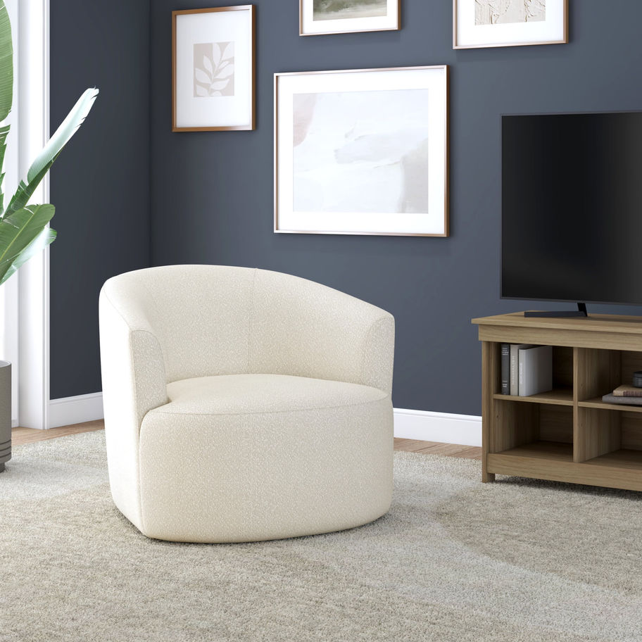 Introduce the Mainstays Swivel Chair to your living area, perfect for adding a touch of comfort and style to any living room, bedroom, or office. With its low-profile barrel back design, this chair serves as a modern accent piece, effortlessly adding a hint of luxury to your space without the need for complex assembly or tools. The chair's cream boucle fabric is versatile, harmonizing with both vibrant and muted color palettes for a classic, elegant look. Made with durable and easy-to-clean upholstery, the Mainstays Swivel Chair is not just an attractive piece, but also a practical choice for busy family homes, guaranteeing lasting appeal and easy maintenance.