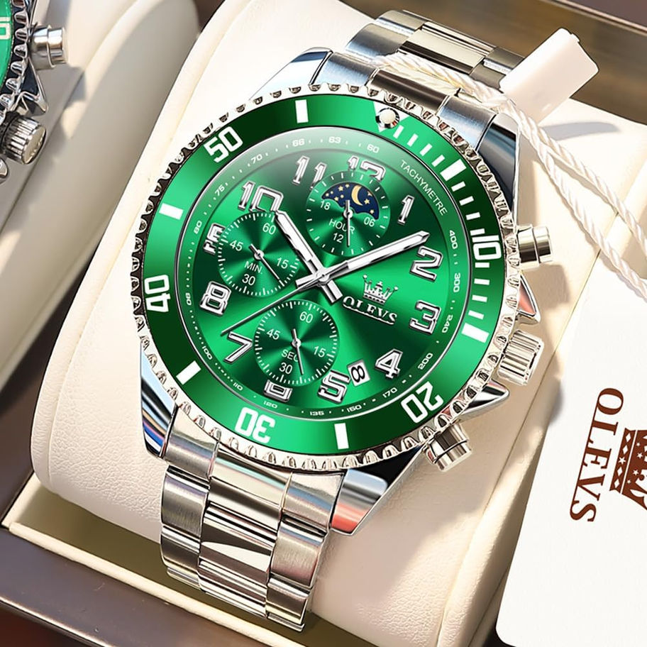 OLEVS Watch Men:This men's chronograph watch combines modern style and premium craftsmanship, featuring a striking green dial and hands that complement the sleek stainless steel case and bracelet.Wear this watch and turn heads wherever you go