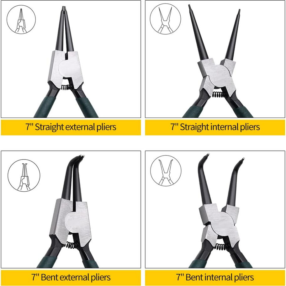 【Package Include】- The snap ring pliers set includes 4pcs 7" internal/external circlip pliers, they are 1pc straight internal snap ring pliers, 1pc 90-degree angled internal snap ring pliers, 1pc straight external snap ring pliers and 1pc 90-degree angled external snap ring pliers