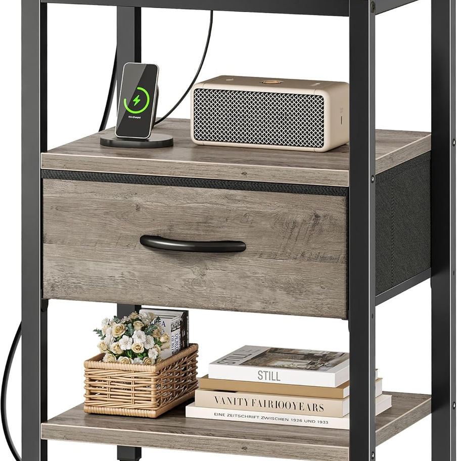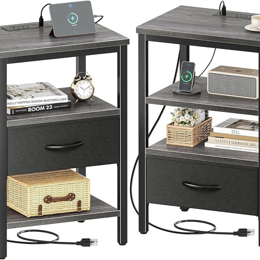 [Go for a Long Time]: Vintage wooden grain shelves blend black fabric and metal frame, making it a timeless classic. Sturdy P2 particle board, sturdy metal frame, and durable fabric drawer, all these work excellently to give this side table with charging station strong support